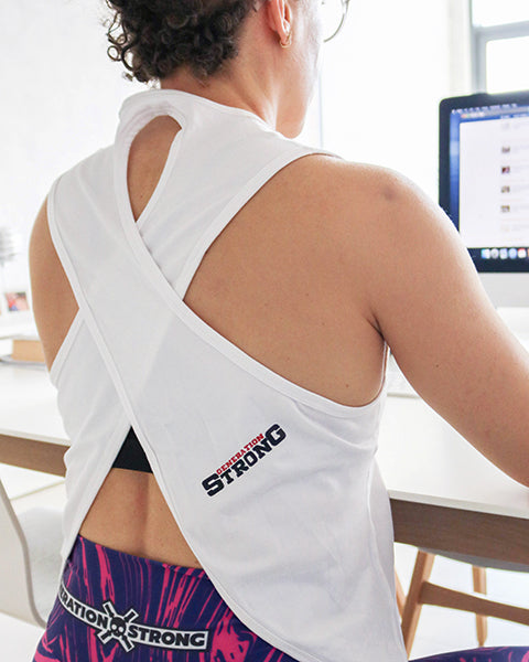 Our classic white Super Strong Crossback is a stylish update from your typical tank top. Made in an airy cotton-blend fabric, this tank has crossover open back design and flattering cut. Whether you're hitting the gym or binge-watching your favorite show, this tank is perfect for showing off your gains.